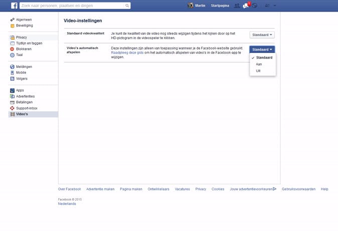 Video's kijken op Facebook kan een superleuke, maar zeer afleidende bezigheid zijn. Juist daarom is het erg irritant dat video's tegenwoordig allemaal automatisch afspelen. Hierdoor is je nieuwsoverzicht waarschijnlijk veranderd in één groot circus dat er voortdurend voor zorgt dat je alles doet behalve datgene waarvoor je eigenlijk Facebook opende. Voor Facebook is dat niet vervelend, maar ik ben blij dat je de functie ook gewoon kunt uitschakelen. Klik op het pijltje naar beneden naast het pictogram met het slotje rechtsboven, en vervolgens op Instellingen. Scrol helemaal naar onderen en klik op het tabblad Video's. Door te klikken op het pijltje naar beneden naast Standaard bij Video's automatisch afspelen, kun je het automatisch afspelen uitschakelen. Daar wordt Facebook ook nog eens een stuk minder traag van! Dit is overigens ook het menu waarin je kunt aangeven dat je alle video's in HD wilt weergeven of juist niet.