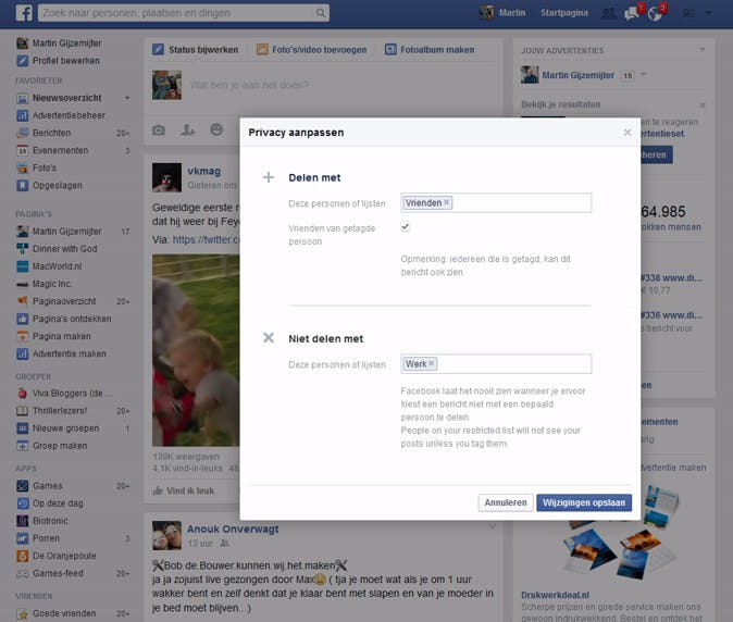 Wanneer je je muisaanwijzer daar overheen beweegt, verschijnt er een optie Meer. Klik daarop. Je ziet nu een aantal lijsten die je al hebt (dit zijn simpelweg groepen met Facebook-vrienden). Je kunt een lijst maken door te klikken op Lijst maken, deze een naam te geven, en leden daaraan toe te voegen. Voeg bijvoorbeeld je werkgever en al je collega's aan een lijst toe die je Werk noemt. Wanneer je nu een nieuwe post plaatst op Facebook, kun je klikken op het uitklapmenu bij de knop Plaatsen en vervolgens kiezen voor Aangepast. Je kunt dan aangeven dat iedereen de post mag zien, behalve de persoon (of in dit geval de lijst) die je selecteert. Op dezelfde manier kun je ook aangeven dat de post juist wél alleen aan die groep getoond mag worden.