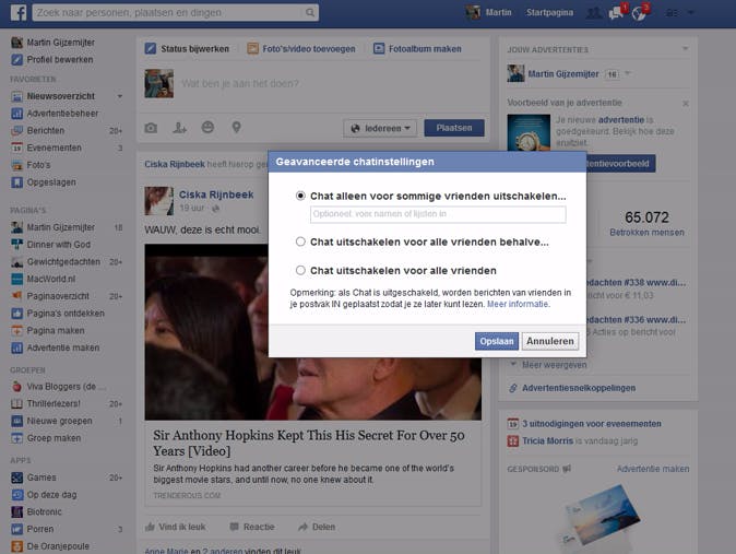 Facebook Chat, ook al zo'n handige functie ... maar als je Facebook de hele dag open hebt staan, kun je horendol worden van al die mensen die spontaan tegen je beginnen te ouwehoeren. Geen probleem, dat is zó verholpen. Helemaal rechtsonder (onder de rechterbalk met contactpersonen) vind je een pictogram met een tandwiel. Klik daarop en kies vervolgens Geavanceerde instellingen. Nu kun je aangeven of je de chat volledig wilt uitschakelen (lekker rustig) of alleen wilt uitschakelen voor bepaalde personen (of voor iedereen, behalve bepaalde personen). Zo kun je de functionaliteit behouden, zonder dat je het idee hebt dat je continu lastiggevallen wordt. Overigens loop je berichten niet mis, ze worden in 'Berichten' geplaatst, je krijgt er alleen geen chatnotificatie van.