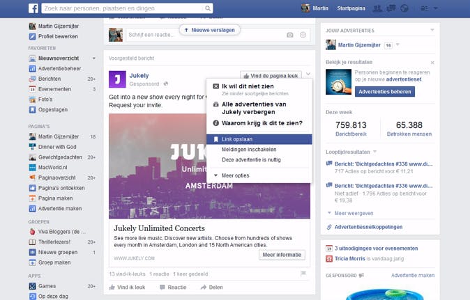 De kans is vrij groot dat je meer vrienden (pardon, kennissen) op Facebook hebt dan er in je nieuwsoverzicht passen. Zelfs als je de eerste stap hebt uitgevoerd, blijft het onmogelijk om alles bij te houden, vooral wanneer het gaat om links in berichten. Zou het dan niet fijn zijn als je die berichten kon opslaan, zodat je die linkjes later kunt bezoeken? Inderdaad, en dat is dan ook waarom die functie gewoon bestaat op Facebook. Wanneer je een bericht tegenkomt met een link die je wilt opslaan, klik dan op het grijze pijltje naar beneden in het bericht en vervolgens op Link opslaan. Wanneer je nu in het linkerdeelvenster klikt op Opgeslagen onder het kopje Favorieten, vind je al deze links (en berichten) weer terug. Dit werkt overigens ook prima voor berichten met video's die je later wilt bekijken.