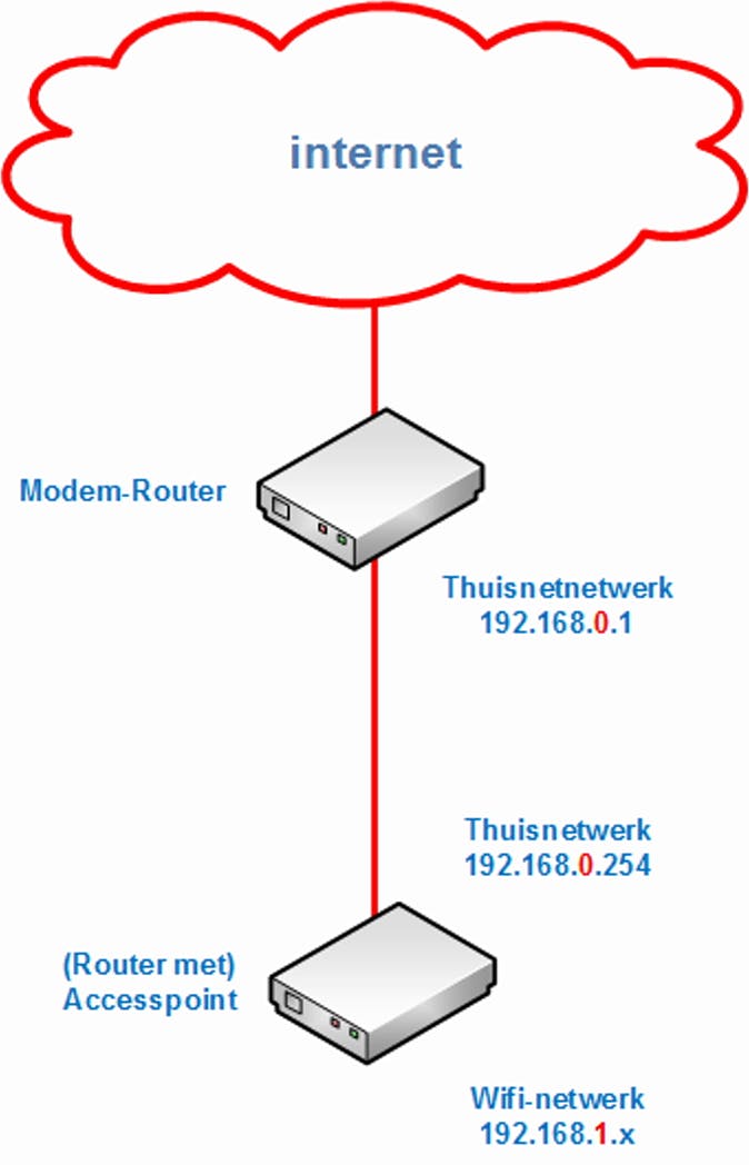 Heb je nog een oude router staan, dan kun je er ook voor kiezen die in de meterkast te zetten, daarvan het accesspoint uit te schakelen en de nieuwe router als accesspoint op een betere plaats te zetten. Het verschil in snelheid voor het bekabelde netwerk in vergelijking met het draadloze netwerk tussen een oude en nieuwe router is vooral bij draadloos groot, bij bedraad veel minder. Tenminste zolang beide routers maar gigabit ondersteunen. Plaats je twee routers achter elkaar, dan kun je ofwel de tweede router in bridge-modus zetten of je moet achter die router en voor het wifi een tweede netwerk configureren met een eigen IP-adressering. Vergeet ook de beveiliging van het wifi niet. Heb je geen router, koop dan een los accesspoint. Die zijn gemakkelijker in het gebruik, doordat deze gewoon onderdeel wordt van het thuisnetwerk en er geen apart tweede IP-netwerk hoeft te worden geconfigureerd.