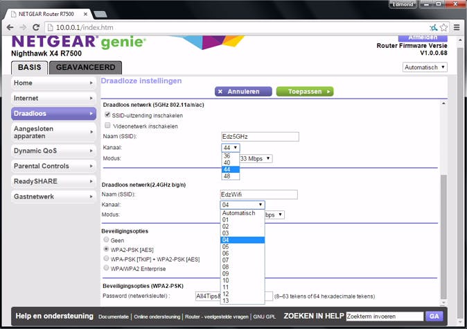 Zoek bijvoorbeeld op InSSIDer Home 3.1.2.1. Start InSSIDer, kies de 2,4GHz- of 5GHz-band en bekijk dan welk kanaal de meeste vrije ruimte heeft. Geen pc, gebruik dan een app als Meraki Wifi Stumbler of WiEye Wifi scanner (beide alleen voor Android). Log dan in op de router en kies bij elk wifi-netwerk in plaats van Auto het juiste kanaal.