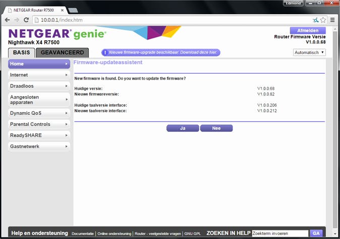 Voor de meeste routers brengen de fabrikanten nog nieuwe firmwares uit. De nieuwe software kan weliswaar de hardware niet aanpassen; hij kan er wel voor zorgen dat die beter wordt gebruikt en dus voor betere prestaties zorgen. Log in op de router en kijk bij Administration of Beheer welke firmwareversie op de router is geïnstalleerd. Kijk dan op de website van de routerfabrikant of er voor dat merk en model een nieuwere firmware is of laat de router zelf zoeken naar een nieuwere firmware. Veel routers kunnen dat, bijvoorbeeld via Advanced settings / Administration / Firmware upgrade, of laten al bij het inloggen zien dat er een nieuwere firmware is.