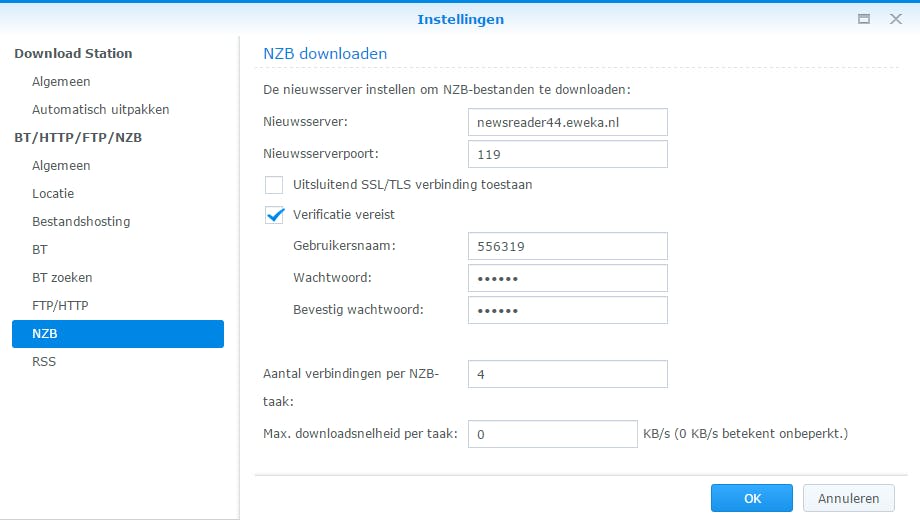 Ben je van plan om bestanden vanaf Usenet te downloaden, dan kies je links voor NZB. Vul alle gegevens in van je Usenet-provider, zoals de nieuwsserver, poort, inloggegevens en hoeveelheid verbindingen. Bevestig als laatste met OK.