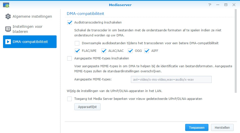 In de applicatie Mediaserver op een Synology-NAS klik je aan de linkerkant op DMA-compatibiliteit. De beschikbare instellingen verschillen per NAS-model. Je kunt een vinkje zetten voor Audiotranscodering inschakelen en de gewenste audioformaten selecteren voor je receiver of multiroom-apparatuur. Recente Synology-apparaten zijn ook in staat om videobestanden te transcoderen naar een ts- en/of asf-indeling. Sla eventuele wijzigingen op via Toepassen.