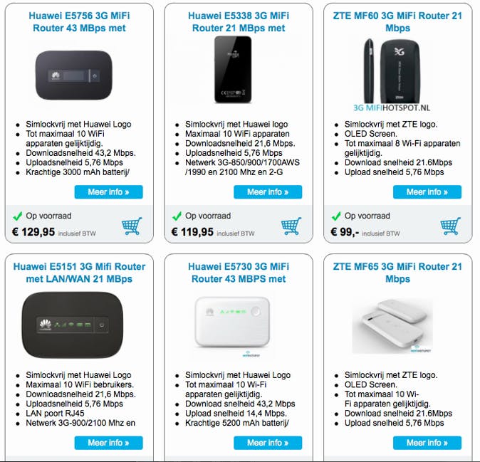 Wil je minder stress bij de aanschaf van een mobiele router en een simkaart, weet dan dat er ook kant-en-klare oplossingen zijn te vinden. Gespecialiseerde websites zoals www.wereldwijdwifi.nl, www.tabletpro.nl, www.mijnmifi.nl en www.droam.nl bieden opties om een router inclusief geconfigureerde simkaart te huren voor een bepaalde tijd. Het grote voordeel van zo'n dienst is dat ze vaak werken met speciale simkaarten voor meerdere landen. Bij Wereldwijd Wi-Fi bestel je bijvoorbeeld een bundel voor de gehele EU. Je betaalt een vaste huurprijs en het maakt niet uit of je de router in Spanje, Tsjechië of Engeland gebruikt. In sommige gevallen worden er geen extra kosten in rekening gebracht als je je databundel overschrijdt, wel wordt de snelheid drastisch verminderd. Afhankelijk van de dienst kun je extra megabytes bestellen tijdens je reis. De bekende providers bieden vaak ook alles-in-één oplossingen aan, maar vaak is dit alleen voor gebruik in Nederland.