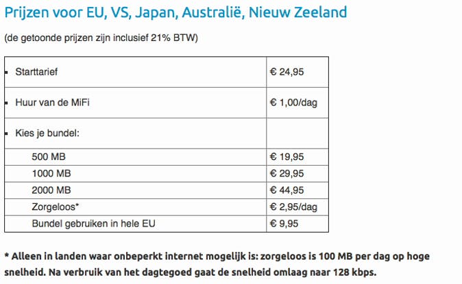 Als je onderweg bent, is er een aantal mogelijkheden om met je smartphone, tablet of laptop verbinding te maken met internet. De makkelijkste optie is om in te loggen op een gratis wifi-netwerk, maar hier ben je over het algemeen beperkt tot hotels, cafés, restaurants of vliegvelden (en bovendien is het niet echt veilig). Lees ook: 13 wifi-tips voor maximaal bereik op vakantie.