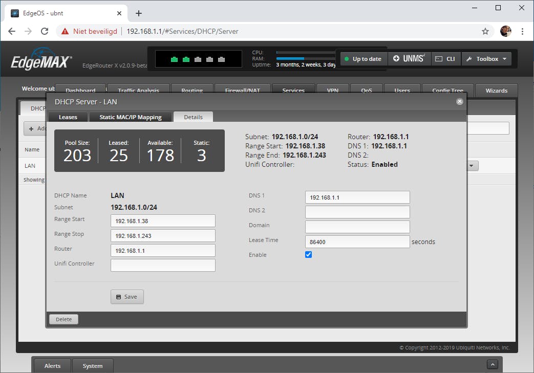 Een apparaat dat je aansluit op je netwerk via een kabel of wifi krijgt automatisch een verbinding met het netwerk en internet. Je router bevat hiervoor een dhcp-server (Dynamic Host Configuration Protocol). Deze zorgt ervoor dat netwerkapparatuur die je aansluit op het netwerk automatisch een ip-adres en andere netwerkinstellingen krijgt toegewezen. Je kunt in de webinterface van je router instellen hoeveel ip-adressen de dhcp-server kan gebruiken.