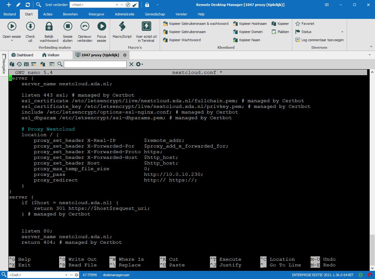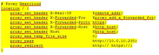 Dit blok ‘luistert’ naar poort 80 voor http-verkeer, zoals aangeven achter listen, en dan specifiek naar de domeinnaam nextcloud.xda.nl, zoals aangeven achter server_name. Het blok bevat vervolgens alleen de doorverwijzing naar https achter return met een 301 response-code (‘moved permanently’). Het andere blok is voor de https-configuratie. Aan dat blok zijn verwijzingen naar de ssl-certificaten toegevoegd, zodat we daar niets meer aan hoeven te doen. Wel moeten we de regels voor de reverse proxy nog toevoegen binnen een blok location. Deze configuratie kan per webdienst soms wat afwijken. Enkele keren zijn aanvullende parameters nodig of gewenst. De configuratie voor Nextcloud is zoals in het volgende codeblok.
