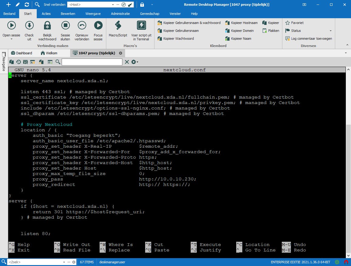 We kunnen nu het Let’s Encrypt-certificaat maken met de opdracht certbot. De eerste keer wordt om een e-mailadres gevraagd en moet je akkoord gaan met de gebruiksvoorwaarden. Hierna kun je steeds kiezen voor welke naam je het certificaat wilt maken. We drukken in dit voorbeeld op 1 voor nextcloud.xda.nl. Als laatste kies je of http-verkeer moet worden omgeleid naar https. Dat betekent dat iemand die de http-pagina (http://nextcloud.xda.nl) bezoekt, wordt doorgezet naar de https-pagina (https://nextcloud.xda.nl). We raden aan dit te gebruiken. Certbot zal de configuratie hierop aanpassen. Open vervolgens het configuratiebestand met teksteditor nano en bekijk wat er is veranderd:
