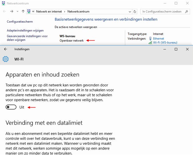 In Windows 10 doe je dat als volgt. Klik in de taakbalk op het wifi-pictogram en kies linksonder in het uitgeklapte paneel op Netwerkinstellingen. Klik op je verbinding, open de rubriek Wi-Fi en selecteer Geavanceerde opties. Zet de schakelaar bij Apparaten en inhoud zoeken op Uit. Je zult merken: in het Netwerkcentrum wijzigt de indicatie Particulier netwerk meteen in Openbaar netwerk. In OS X op je Mac zorg je er maar beter voor dat de firewall is geactiveerd en dat bestandsdeling is uitgeschakeld. Beide opties bereik je via Systeemvoorkeuren.