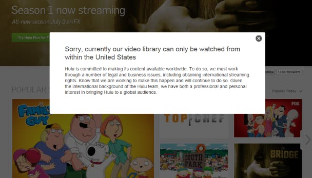 Een VPN heeft nog een ander voordeel: de websites die je bezoekt terwijl je met een VPN-server verbonden bent, zien het IP-adres van de VPN-server, niet dat van jou. Handig als je de website niet vertrouwt en niet wilt dat ze je IP-adres kent. Nog handiger is dat je met een VPN landrestricties kunt omzeilen. Een website kan immers aan je IP-adres zien uit welk land je komt. Een website zoals Hulu weigert zijn series en films te tonen aan Nederlanders en Belgen. Daar steek je echter een stokje voor als je eerst een VPN-verbinding naar een Amerikaanse server opzet. Voor Hulu lijkt het dan alsof je zelf uit Amerika komt, waardoor de website je probleemloos zijn video's voorschotelt. Tenminste, zolang je VPN-provider niet op een zwarte lijst staat, want sinds enkele maanden blokkeert Hulu gebruikers van bekende Amerikaanse VPN-diensten.