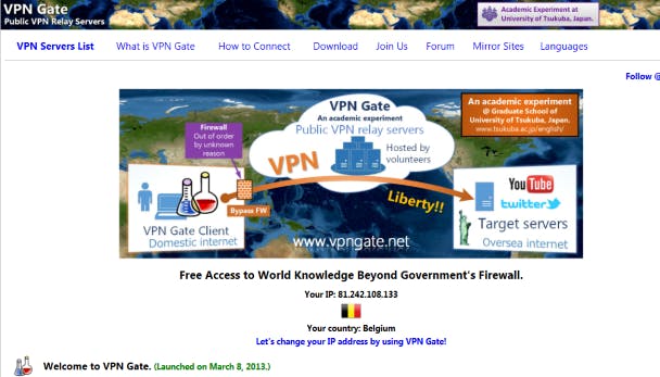 Op websites zoals VPN Gate vind je talloze gratis te gebruiken VPN-servers.
