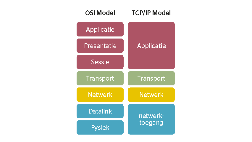 Het bekende – uit zeven lagen bestaande – OSI-model, ontwikkeld door ISO (International Organization for Standardization).