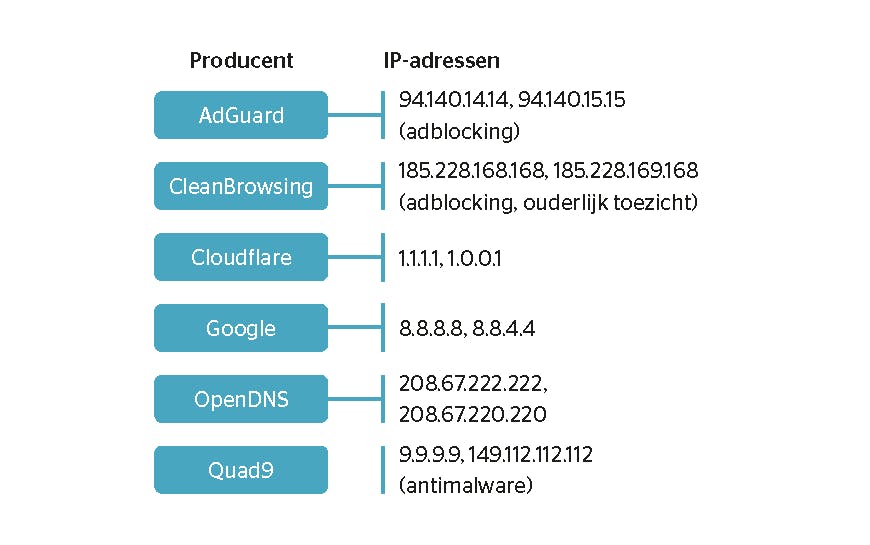 Dit zijn de bekendste publieke DoH-servers met bijbehorende IP-adressen.