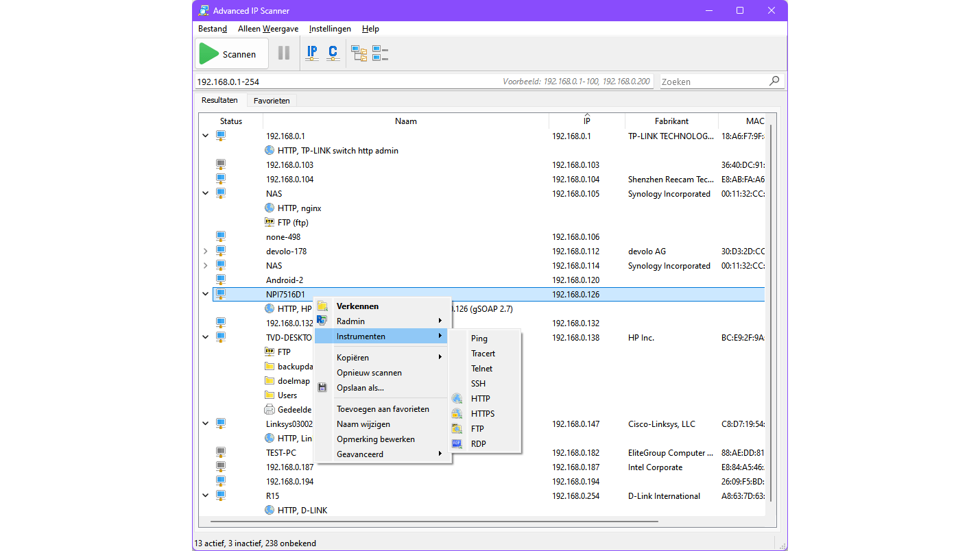 Het eveneens gratis Advanced IP Scanner heeft een geheel andere functie. Deze tool detecteert apparaten met een IP-adres in je lokale netwerk. Het werkt eenvoudig: start de applicatie, vul het gewenste netwerkbereik in (bijvoorbeeld 192.168.0.1-254) en klik op Starten. Na afloop verschijnen alle gedetecteerde apparaten in het venster, met hun IP- en MAC-adres (het unieke fysieke adres van elke netwerkadapter). Wanneer je een item openvouwt, kunnen onder meer de bijbehorende gedeelde mappen en enkele services verschijnen. Vanuit het contextmenu, bij Instrumenten, kun je direct verbinding maken met het apparaat via protocollen als HTTP(S), FTP, SSH en RDP.