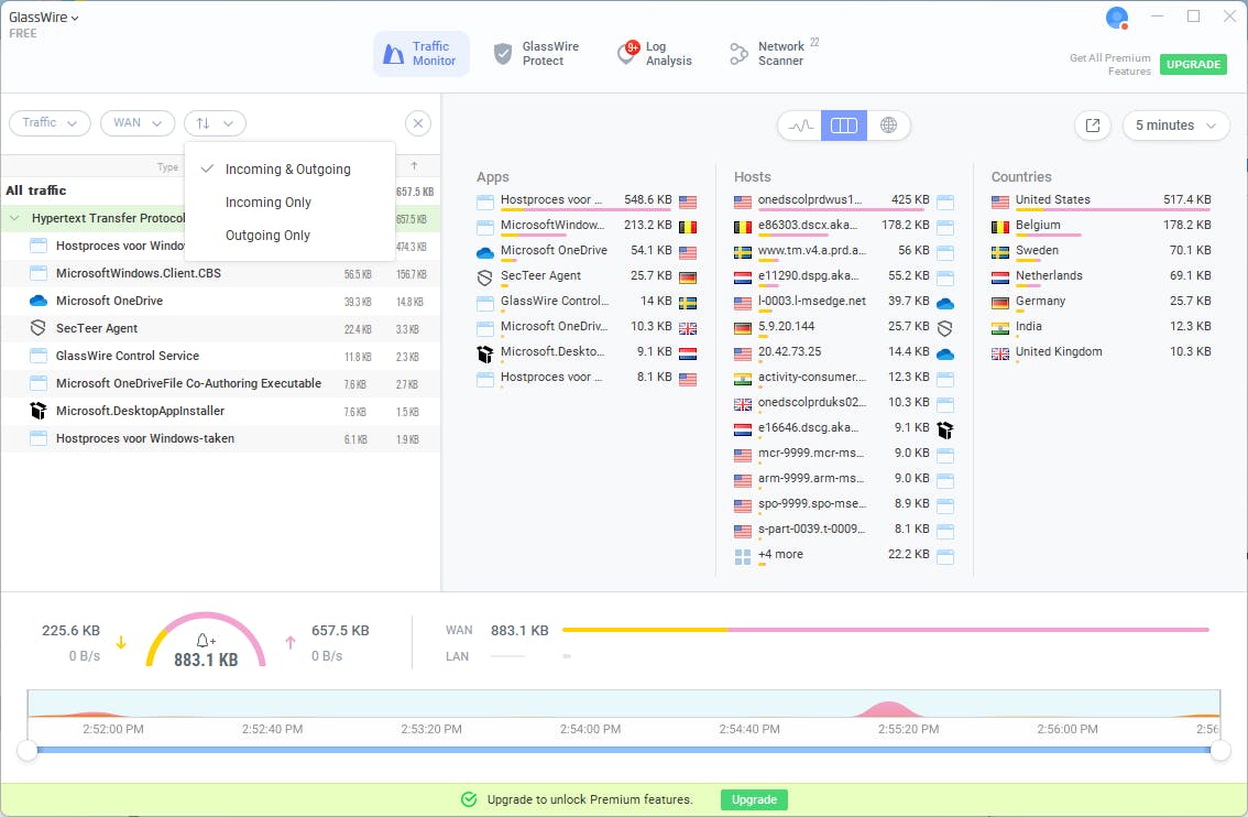 GlassWire begint eigenlijk waar Advanced IP Scanner ophoudt. Met dit programma kun je apparaten op het lokale netwerk detecteren en identificeren, en bovendien bevat het allerlei monitoring- en beveiligingsfuncties. GlassWire geeft een realtime overzicht van het netwerkverkeer, inclusief gegevens over welke processen verbinding maken met het internet. Je kunt tevens het actuele en historische bandbreedtegebruik per applicatie en netwerkadapter volgen. De applicatie integreert zich ook in Windows Firewall, zodat je eenvoudig applicaties kunt blokkeren. Daarnaast ontvang je beveiligingswaarschuwingen bij verdachte activiteiten, nieuwe netwerkverbindingen of wijzigingen in netwerkconfiguraties. GlassWire bedient zich hiervoor van diverse netwerkprotocollen, waaronder HTTP(S), DNS, NetBIOS, ICMP en ARP.