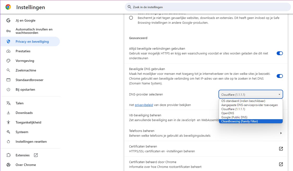 De meeste browsers, waaronder Chrome, ondersteunen beveiligde DNS.