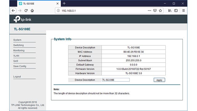 Een managed switch heeft een eigen ip-adres. Via dat ip-adres vind je ook de webinterface voor het beheer van de switch. In de fabriek is dat voor deze switch (v3 en ouder) ingesteld op 192.168.0.1. We veranderen dat eerst naar dhcp door tijdelijk een pc aan te sluiten en de pc een ip-adres in datzelfde ip-bereik te geven (bijvoorbeeld 192.168.0.10 met subnetmasker 255.255.255.0). Je logt dan met de pc in op de webinterface van de switch op 192.168.0.1 met gebruikersnaam en wachtwoord admin.