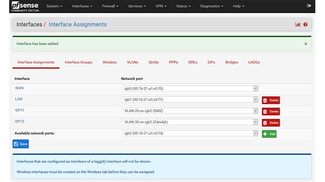 Voor deze masterclass maken we als voorbeeld de vlan’s 20 (met naam DMZ) als niet-vertrouwd netwerk met subnet 10.0.20.0/24 en vlan 30 (met naam Zakelijk) als vertrouwd netwerk met het subnet 10.0.30.0/24. Ook willen we dat voor iedere vlan een dhcp-server correcte ip-adressen uitdeelt. Het is het veiligst om vlan’s te maken op een interface die je (nog) niet in gebruik hebt. Met een interface wordt een fysieke netwerkpoort bedoeld. Onder Interface / Assisgnments zie je welke gebruikt of beschikbaar zijn.