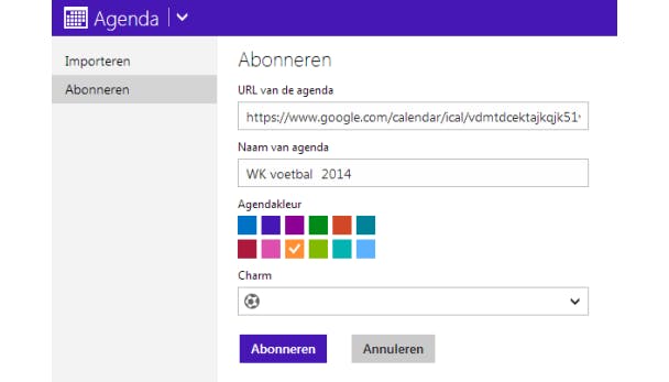 Wil je graag de wedstrijden zichtbaar krijgen in je Outlook-agenda? Open dan het programma, kies linksonder Agenda en selecteer in het lint Agenda openen / van internet... Kopieer in het venstertje dat verschijnt deze url in en klik op Ok. Op de vraag of je ook updates wilt ontvangen kies je Ja. Op deze manier worden de wedstrijden na de poulefase automatisch geüpdatet.