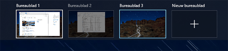 Nog veel Windows 10-gebruikers negeren de virtuele bureaubladen. Het is niets anders dan een ander bureaublad waarop je andere applicaties kunt laten draaien waardoor het lijkt alsof je een tweede exemplaar van een besturingssysteem op dezelfde pc gebruikt. Wanneer je het werken met virtuele bureaubladen in de vingers hebt, zul je merken dat dit rustgevend werkt, omdat je, zeker wanneer je werkt op een klein scherm, dan niet meer alles naast elkaar hoeft te zetten. Met Windows+Tab kun je deze vernieuwde Taakweergave bekijken en links bovenaan voor Nieuw bureaublad kiezen om een nieuw virtueel bureaublad aan te maken. Schakelen tussen de verschillende bureaubladen doe je eveneens met Windows+Tab of, nog veel sneller, Windows-toets+Ctrl+pijltjestoetsen.