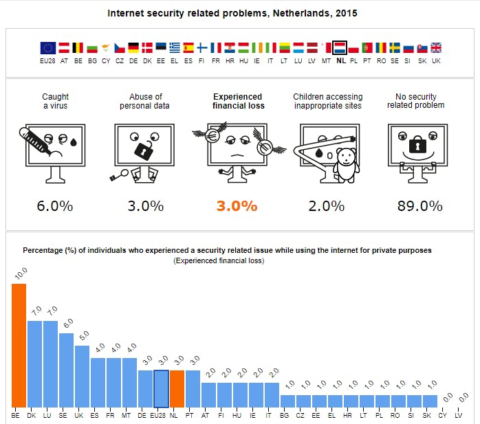 Er is een opvallend historisch verschil tussen Nederland en België wanneer het gaat om deze vorm van internetcriminaliteit, volgens een onderzoek van Eurostat naar aanleiding van Safer Internet Day uit 2015. 20% van de Belgen gaf aan in dat jaar een virus of computerinfectie te hebben gehad. Nederland is op dit punt het beste jongetje van europa met 6%. Van de Belgen raakte 10% geld kwijt aan internetcriminelen, grotendeels door phishing, van de Nederlanders was dat 3%. In beide landen was ook nog 1% gedupeerd door Er is nog geen Europees rapport voor 2017. Febelfin, de federatie van Belgische banken, berekende al wel dat het aantal fraudegevallen in de eerste negen maanden van 2017 al vijfmaal hoger lag dan in 2015. De favoriete modus operandi van de oplichters blijft phishing. Volgens Febelfin leggen de fraudeurs zich nu vooral toe op kleinere bedragen om zo lang mogelijk onder de radar te blijven.