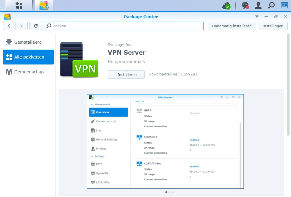 De vpn-server van Synology ondersteunt zowel PPTP, OpenVPN als L2TP/IPSec. Alleen de laatste twee zijn interessant. Eventueel kun je beide instellen, maar in deze basiscursus beperken we ons tot OpenVPN. Het biedt goede prestaties én een goede veiligheid, met bovendien veel vrijheid bij de configuratie. Om het te installeren ga je naar Package Center. Zoek VPN Server op en installeer de toepassing. Bij QNAP open je App Center en zoek je QVPN Service op in het onderdeel Utilities. Deze toepassing ondersteunt naast bovengenoemde protocollen ook het door QNAP zelf ontwikkelde QBelt-protocol. De toepassing van QNAP kun je overigens ook als vpn-client gebruiken door profielen toe te voegen, voor als de nas een externe vpn-server moet gebruiken. Bij Synology kan dat ook, je vindt de optie onder Netwerk in het Configuratiescherm.