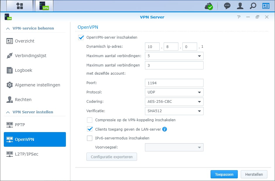 De optie Compressie op de VPN-koppeling inschakelen zetten we bij voorkeur uit. De meerwaarde is beperkt en het is niet zonder risico’s vanwege enkele kwetsbaarheden. Klik ten slotte op Toepassen gevolgd door Configuratie exporteren om het zip-pakketje op te halen waarmee je straks de verbinding opzet. Onder Overzicht zie je dat OpenVPN is ingeschakeld. Gebruik je de firewall op je nas? Ga dan naar Configuratiescherm / Beveiliging / Firewall en voeg een regel toe die verkeer voor de vpn-server toestaat.