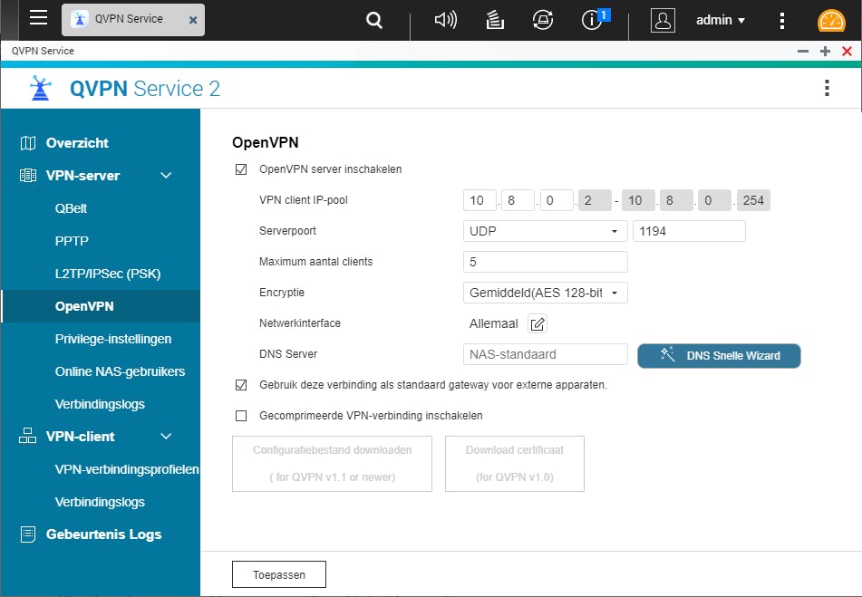 Op een QNAP-nas open je de toepassing QVPN Service en kies je onder VPN-server de optie OpenVPN. Zet een vinkje bij OpenVPN server inschakelen en pas de configuratie naar voorkeur aan. Net als bij Synology kun je het protocol en de poort vrij instellen. Voor de codering wordt standaard AES gebruikt met een sleutel van 128 bit (standaard) of 256 bit. De optie Gecomprimeerde VPN-verbinding inschakelen zetten we uit. Klik vervolgens op Toepassen. Hierna kun je het OpenVPN-profiel downloaden, dat ook het certificaat bevat. Dit gaan we onder Android gebruiken. Onder Overzicht kun je zien of de vpn-server actief is met ook andere details zoals verbonden gebruikers.