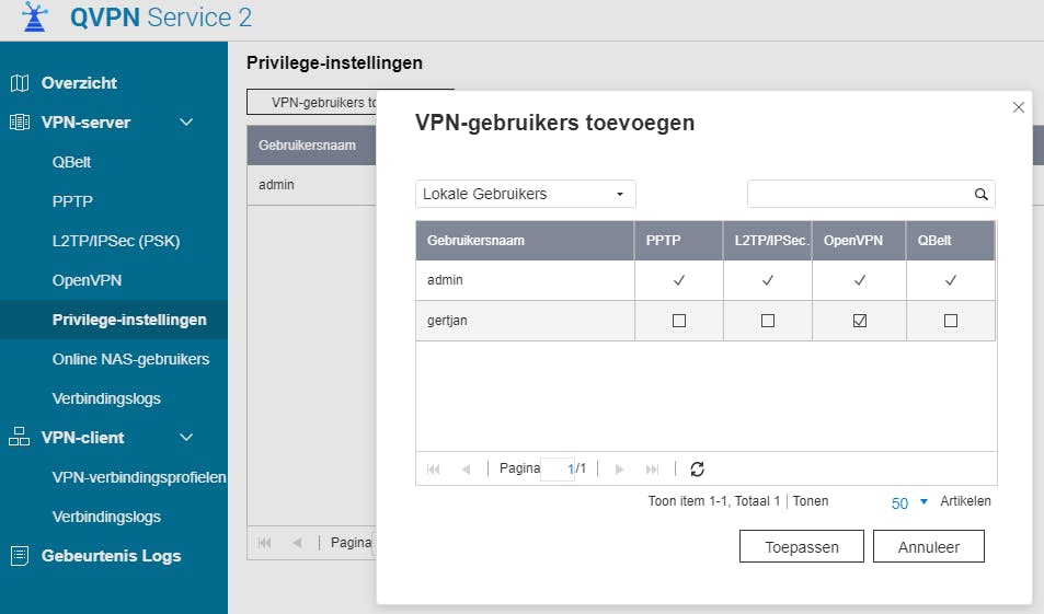 Om in te loggen op de vpn-server is ook een gebruikersaccount nodig. Dat is een gewoon gebruikersaccount op de nas met de juiste rechten om de vpn-server te gebruiken. Bij Synology hebben standaard alle gebruikers de mogelijkheid om de vpn-server te gebruiken. Pas dit naar voorkeur aan door in VPN Server naar Rechten te gaan. Bij QNAP ga je in QVPN Service naar Privilege-instellingen. Hier voeg je de gewenste vpn-gebruikers handmatig toe vanuit de lokale gebruikers op de nas.
