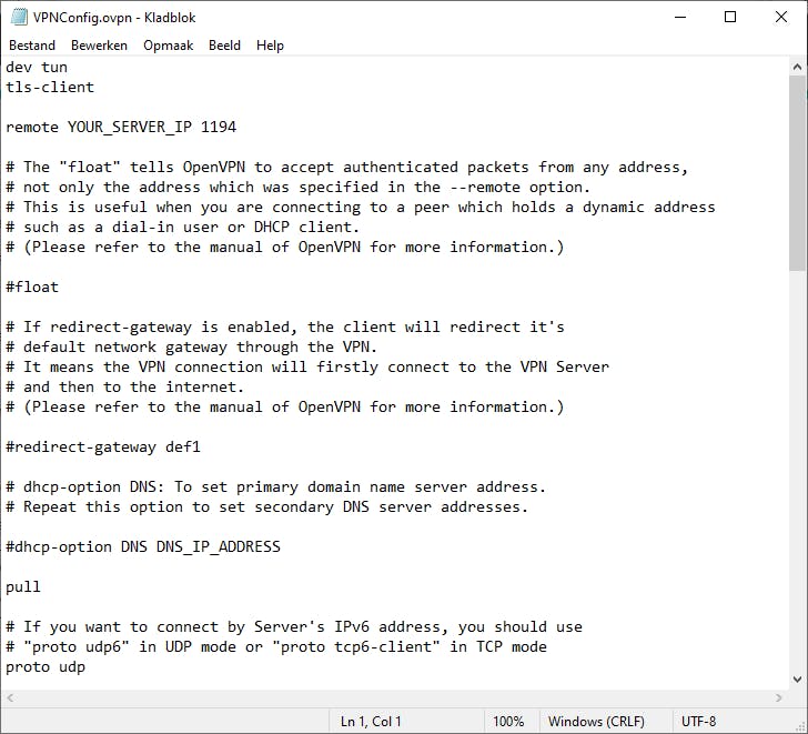 Je moet het OpenVPN-profiel even doorlopen in een teksteditor en waar nodig aanpassingen maken. Bij Synology pak je daarvoor het zip-bestand (openvpn.zip) uit in een map waarna je het bestand VPNConfig.ovpn kunt openen in je teksteditor. Hierin vind je de regel remote YOUR_SERVER_IP 1194 en iets verderop proto udp. Dit geeft aan welk poortnummer (1194) en protocol (udp) moeten worden gebruikt bij het opzetten van de verbinding. Op de plek van YOUR_SERVER_IP vul je het ip-adres van je internetverbinding thuis in, bij QNAP is dat al standaard ingevuld.