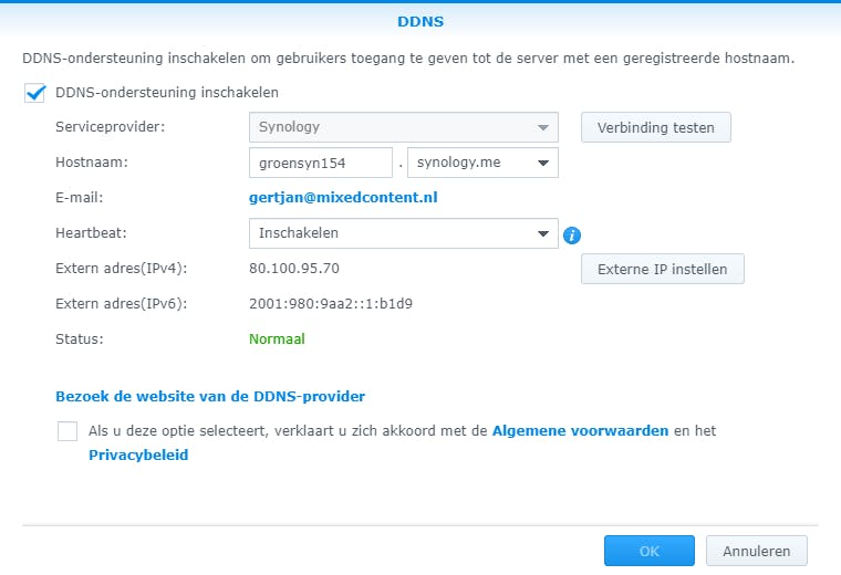Krijg je van jouw internetprovider voor de internetverbinding thuis geen vast maar een dynamisch en dus wisselend ip-adres? Dan is een dynamic-dns-dienst (ddns) een goed alternatief. Je kunt het gewoon op je nas instellen (zie kader ‘Dynamic dns-dienst op je nas’) en het adres vervolgens invullen op de plek van het ip-adres in het profiel (dat gebeurt niet automatisch). Bij Synology is dynamic dns extra handig, omdat je het aangemaakte servercertificaat dan kunt gebruiken voor het opzetten van de verbinding, om een certificaatprobleem op te lossen.