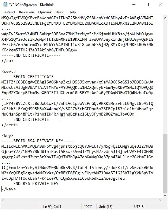 Pak het zip-bestand uit. Open het OpenVPN-profiel in een teksteditor. Onderaan zie je een blokje <ca></ca> met de inhoud van ca.crt. Daaronder voeg je een blok <cert></cert> toe waarin je de inhoud van cert.pem zet. Voeg vervolgens nog een blok <key></key> toe met daarin de inhoud van privkey.pem. Met dit profiel kun je in combinatie met het gebruikersaccount op je nas een verbinding opzetten.