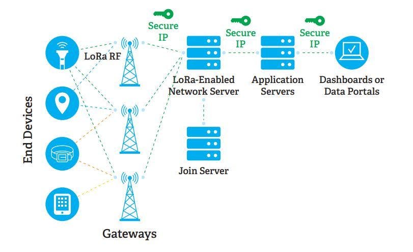 Via wifi, ethernet of een mobiele dataverbinding stuurt elke gateway de boodschappen door naar een centrale netwerkserver. Mogelijk ontvangen meerdere gateways dezelfde boodschap van een node. De netwerkserver filtert die dubbel ontvangen boodschappen eruit. Ook verzekert de netwerkserver de authenticiteit van elke node op het netwerk en de integriteit van elke boodschap. Alle LoRaWAN-boodschappen tussen de nodes en de netwerkserver zijn met een 128bit-AES-sleutel versleuteld.