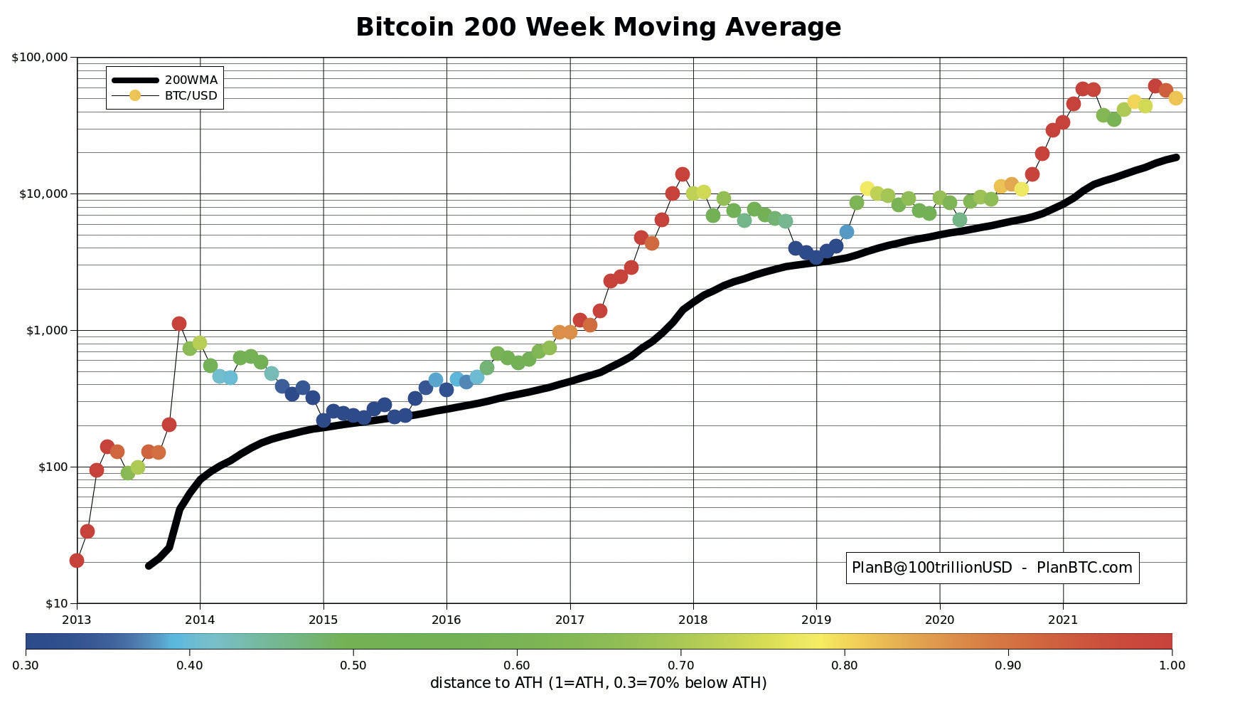Vrijheid is maar één kant van het verhaal. Je kunt bitcoin ook zien als een investering – net als de talloze altcoins – of als een manier om je in te dekken tegen inflatie. Historisch heeft de koers van de bitcoin ondanks de volatiliteit een sterke groei laten zien. Kijk bijvoorbeeld naar het voortschrijdend gemiddelde over tweehonderd weken waar het altijd boven is gebleven.
