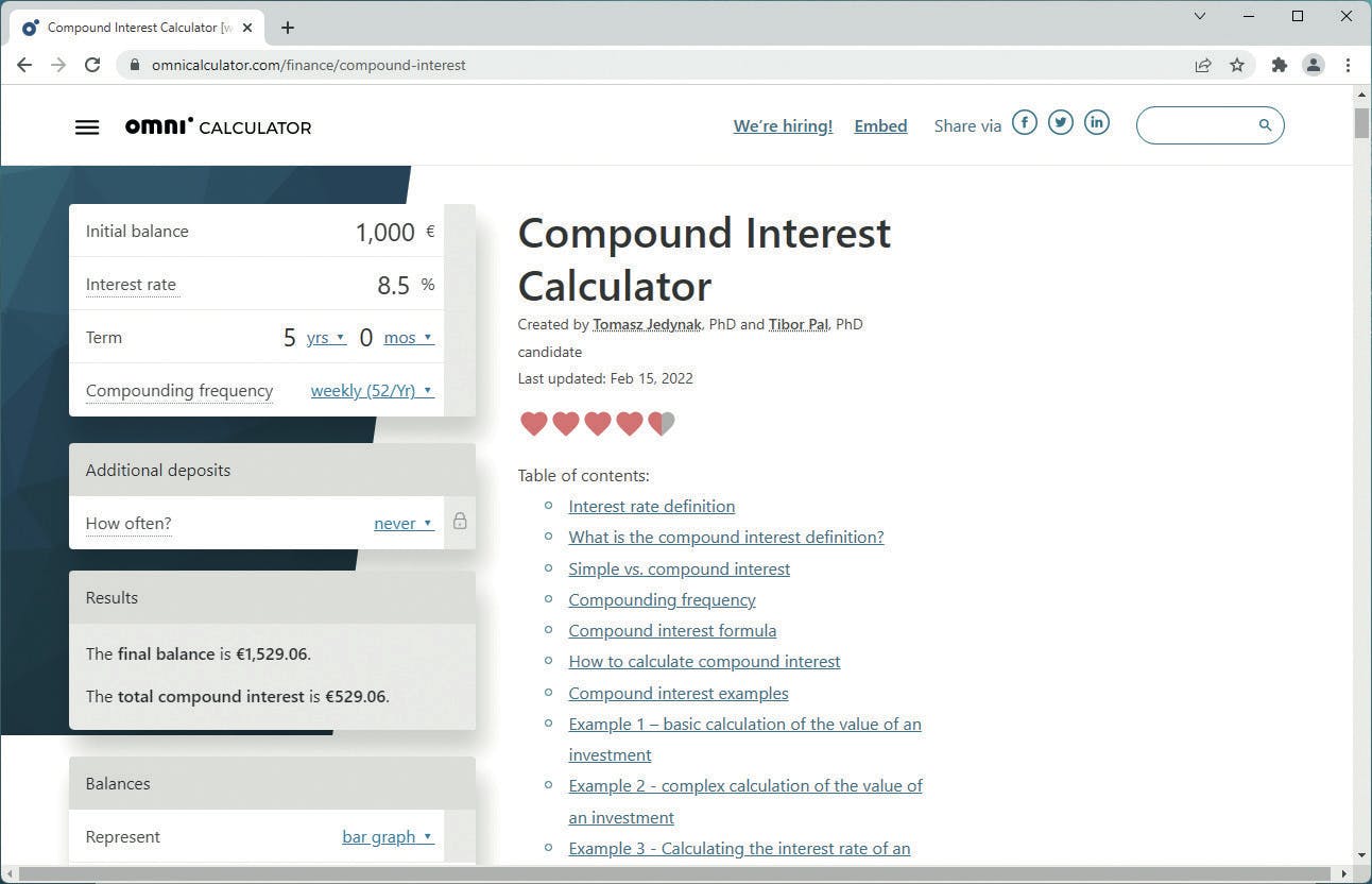 Over langere tijd wordt het verschil groter. Zo is na vijf jaar de oorspronkelijke 1000 dollar gegroeid tot 1.529 dollar. Je kunt het narekenen met de calculator van Celsius zelf of een algemene calculator zoals https://kwikr.nl/omnicalc. Je voert de inleg (bijvoorbeeld 1000 dollar) in, het rentepercentage (bijvoorbeeld 8,50 procent), de uitbetalingsfrequentie (wekelijks), de gewenste termijn en eventuele periodieke stortingen die je wilt gaan doen.