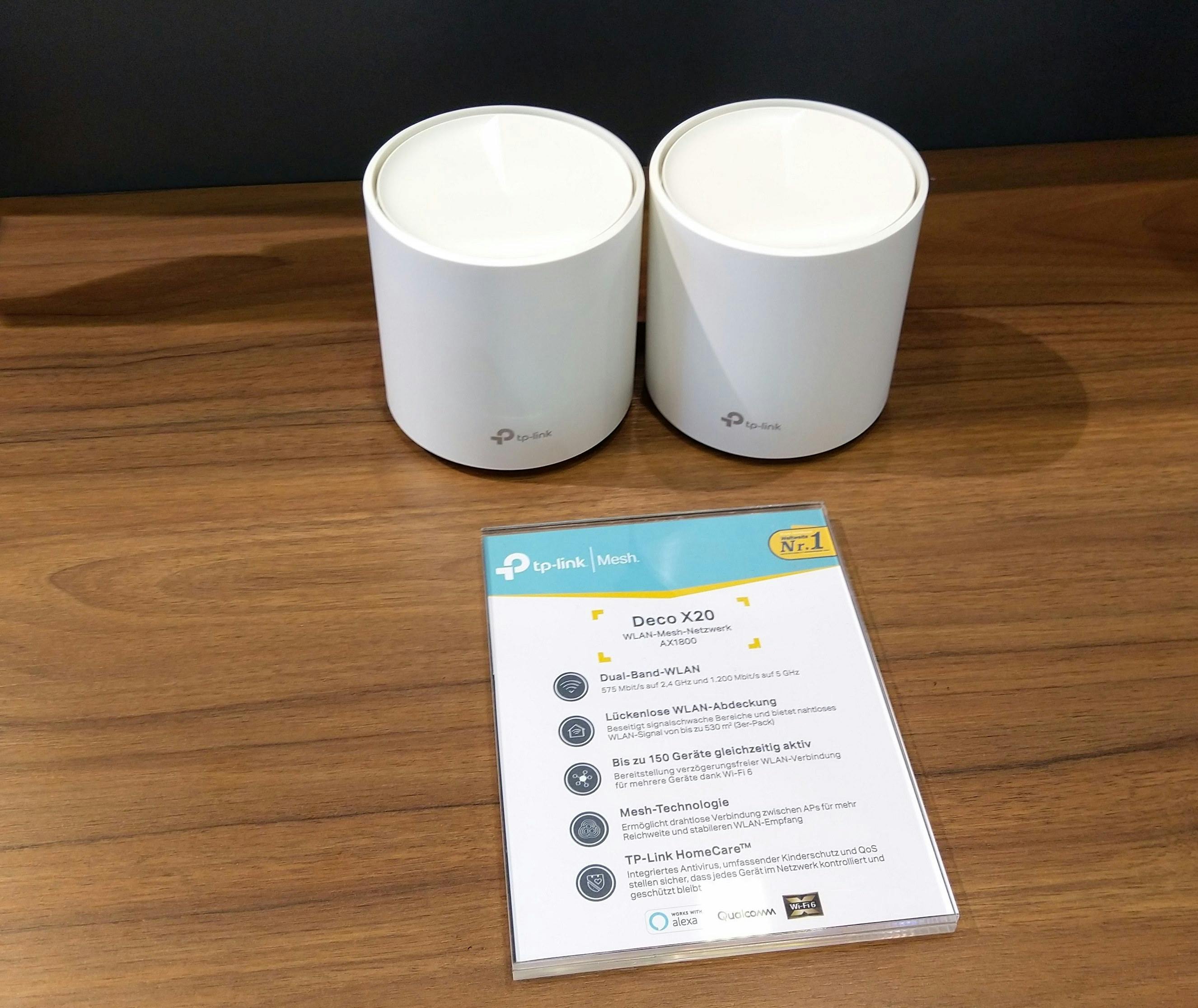 TP-Link onthulde op IFA twee wifi 6 wifi-mesh-systemen. De TP-Link Deco X20 en de Deco X60. Beide systemen zijn dualband-oplossingen met één 2,4GHz- en één 5GHz-radio. De Deco X20 is een AX1800-systeem terwijl de X60 een AX3000-systeem is. Beide wifi-mesh-systemen bieden 575 Mbit/s op de 2,4GHz-band, vermoedelijk met twee streams. Het verschil tussen de X20 en X60 zit hem in de 5GHz-band. De X20 biedt 1200 Mbit (vermoedelijk twee streams) terwijl de X60 2400 Mbit/s biedt (vermoedelijk vier streams). De systemen komen in december op de markt. De Deco X20 kost 299 euro voor een pakket bestaande uit 3 nodes terwijl de Deco X60 399 euro kost voor een pakket bestaande uit 3 nodes.