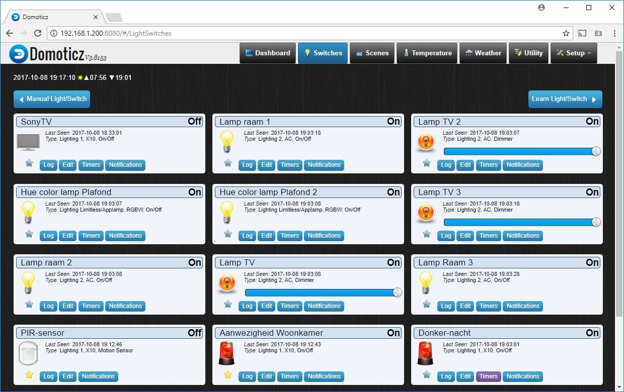 Gedurende het automatiseren van mijn slimme huis met behulp van een Raspberry Pi is mijn mening behoorlijk veranderd. Aanvankelijk wilde ik een soort ultieme app hebben waarmee ik alles vanuit één plek kon bedienen en eventueel kon automatiseren. Vandaar de keuze voor het qua interface fraaie en flexibele Home Wizard. In de praktijk bleek ik dat dashboard toch niet te gebruiken. Domoticz bleek handiger om snel aanpassingen in de regels door te voeren. Op het dashboard van Domoticz heb ik geen schakelaars staan waarmee ik handmatig de verlichting kan bedienen. Die heb ik niet nodig, ik gebruik dat dashboard nauwelijks. Er wordt ook enkel vanwege troubleshooting-doeleinden getoond of er beweging gedetecteerd is. Verder toont het dashboard de huidige temperatuur afkomstig van de Nest Thermostaat en het huidige energieverbruik afkomstig uit de slimme meter. Eventueel zijn losse lampen via het tabblad Switches wel te bedienen, maar voor handmatige bediening vind ik de wandschakelaars, afstandsbediening of Philips’ eigen app toch handiger.