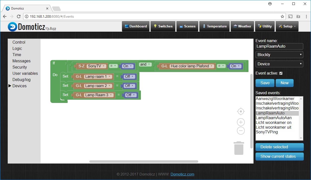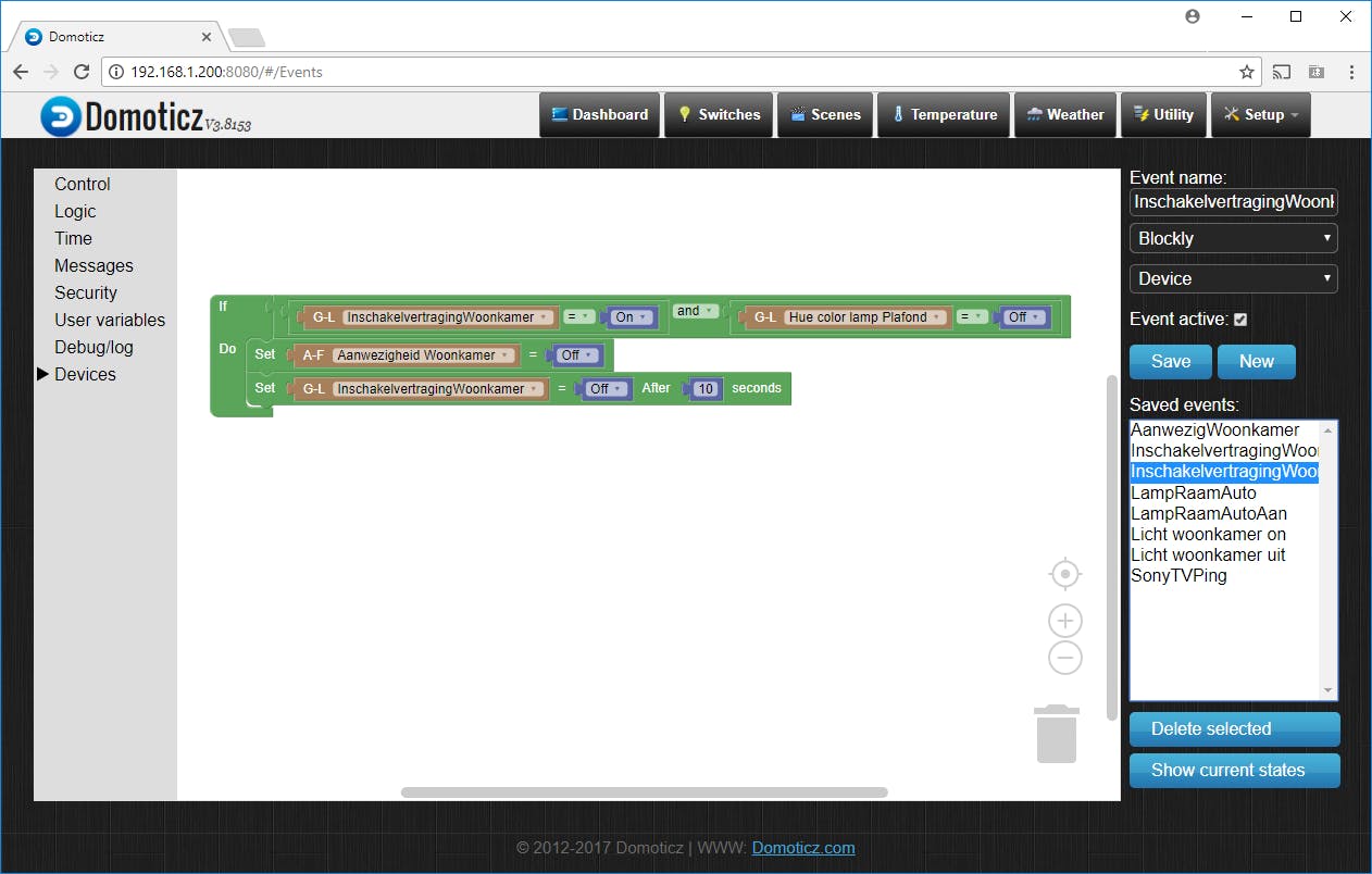 Na wat experimenteren besloot ik dat Home Assistant de beste interface bood. Dit pakket is namelijk erg flexibel qua indeling en ziet er in vergelijking met bijvoorbeeld Domoticz lekker modern uit. Het nadeel van Home Assistant ten opzichte van Domoticz is dat het systeem geprogrammeerd wordt in scrips die je moet uploaden naar de Pi; via de webinterface kun je geen veranderingen of instellingen doorvoeren. Maar ik was met Home Assistant in m’n thuisnetwerk niet tevreden. Het eerdere nadeel van de app bleef bestaan: ik vond het nog steeds onhandig om de verlichting met een smartphone in te schakelen. Ik bleek dus eigenlijk helemaal geen behoefte te hebben aan een mooie interface, en besloot daarom Domoticz een tweede kans te geven. Domoticz kun je geheel instellen via de webinterface en naast scripts kun je ook visueel programmeren in Blockly. Hierdoor kun je snel nieuwe ideeën uitproberen.