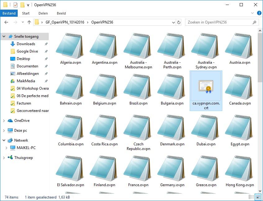 Voor het instellen van een vpn-verbinding gebruiken we de gratis software OpenVPN. Je dient hiervoor een apart configuratiebestand bij de vpn-dienst op te halen, namelijk een zogeheten ovpn-bestand. De meeste vpn-aanbieders hebben een aparte webpagina ingericht waar je een ziparchief kunt downloaden, waaronder VyprVPN. Na het uitpakken van dit zip-archief staan er vaak twee mappen voor je klaar. Hierbij heb je de keuze tussen 160bit- en 256bit-encryptie. Laatstgenoemde versleutelingsmethode is de veiligste optie. Open de map en je ziet dat er meerdere ovpn-bestanden voor verschillende landen beschikbaar zijn. Sommige vpn-aanbieders hebben als alternatief een online assistent waarmee je het gewenste ovpn-bestand kunt genereren, zoals CyberGhost.