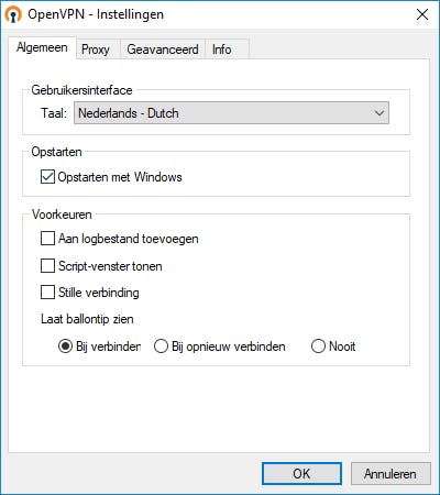 Hoog tijd om met de software aan de slag te gaan. Navigeer in het startmenu naar OpenVPN en klik met de rechtermuisknop op OpenVPN GUI. Je kiest vervolgens voor Meer / Als administrator uitvoeren en bevestigt met Ja. Je ziet dat er rechtsonder in het systeemvak een extra pictogram is bijgekomen, namelijk een beeldscherm met een slotje. Wanneer je dit pictogram niet ziet, klik je eerst op het kleine pijltje Verborgen pictogrammen weergeven. Start je OpenVPN in het vervolg graag automatisch met Windows op? Klik met de rechtermuisknop op het systeemvakpictogram en kies voor Instellingen. Zet een vinkje voor Opstarten met Windows en bevestig met OK.