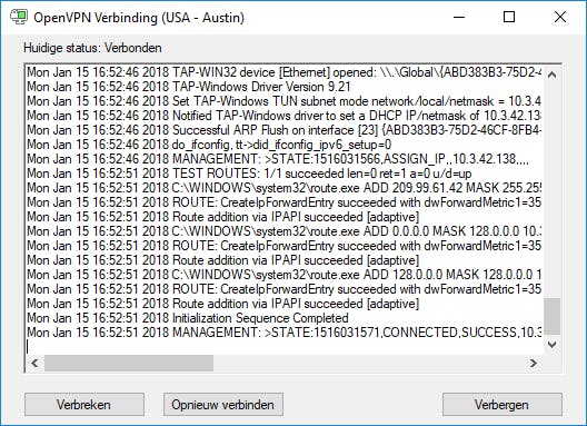 Als OpenVPN een correcte vpn-verbinding heeft opgezet, kleurt het systeemvakpictogram groen. Afhankelijk van de gebruikte vpn-aanbieder is de internetverbinding nu mogelijk iets trager. Wil je graag weten welk (buitenlands) ip-adres je computer momenteel gebruikt? Ga met de muisaanwijzer op het OpenVPN-pictogram staan en de informatie verschijnt als ballontip in beeld. Verder staat ook aangegeven in welk land de vpn-server is gehuisvest. Wil je de vpn-verbinding weer afbreken? Dubbelklik op het pictogram om het venster met statusinformatie op te roepen. Kies daarna voor Verbreken.
