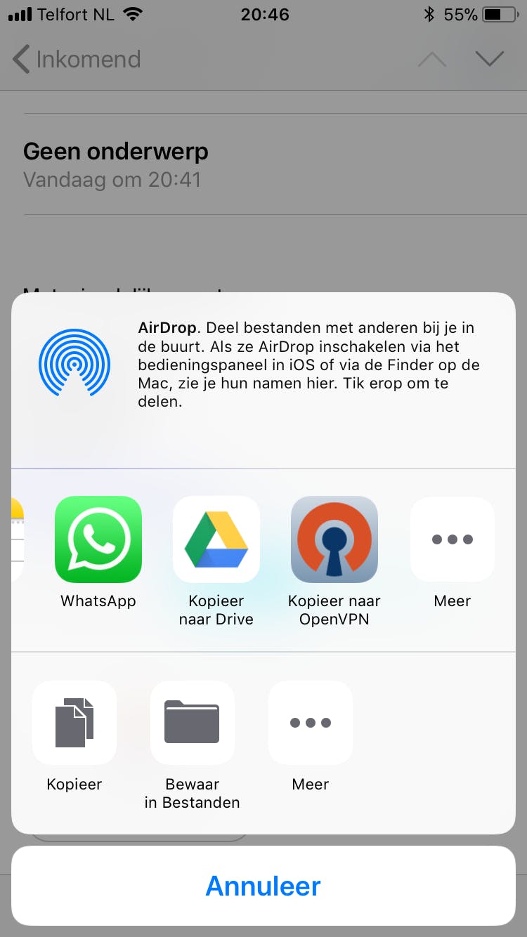 OpenVPN Connect is ook beschikbaar voor iOS (iPhone en iPad). Je downloadt deze toepassing vanuit de App Store. In tegenstelling tot Android is het toevoegen van een ovpn-bestand wel iets omslachtiger, aangezien je niet direct toegang hebt tot de mappenstructuur van iOS. Het heeft dus weinig zin om naar de downloadpagina van de vpn-aanbieder te surfen. De gemakkelijkste methode is door het configuratiebestand naar jezelf te mailen. Open de Mail-app en tik vervolgens op de bijlage. Kies daarna voor Kopieer naar OpenVPN om het ovpn-bestand te importeren. Hoewel deze wijze erg vlot werkt, is er wel een klein risico op onderscheppingsgevaar.