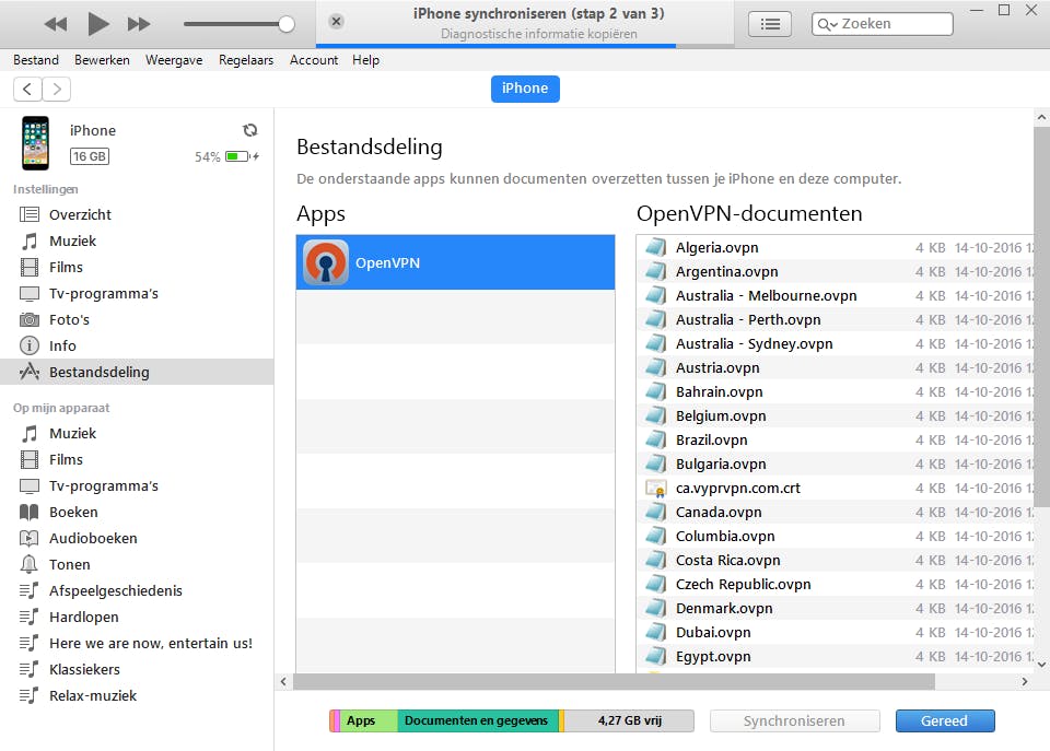 Wie meer veiligheid wenst, voegt de configuratiebestanden rechtstreeks via een usb-verbinding aan de iPhone of iPad toe. Je gebruikt hiervoor iTunes. In dit programma open je de inhoud van je iOS-apparaat. Kies onder Instellingen voor Bestandsdeling. Alle apps waarnaar je documenten kunt overzetten verschijnen in beeld, waaronder dus in elk geval OpenVPN. Klik daarop en selecteer via Bestand toevoegen alle configuratiebestanden. Zodra je bevestigt met Openen en Synchroniseren hevelt iTunes de data over naar het mobiele Apple-apparaat.