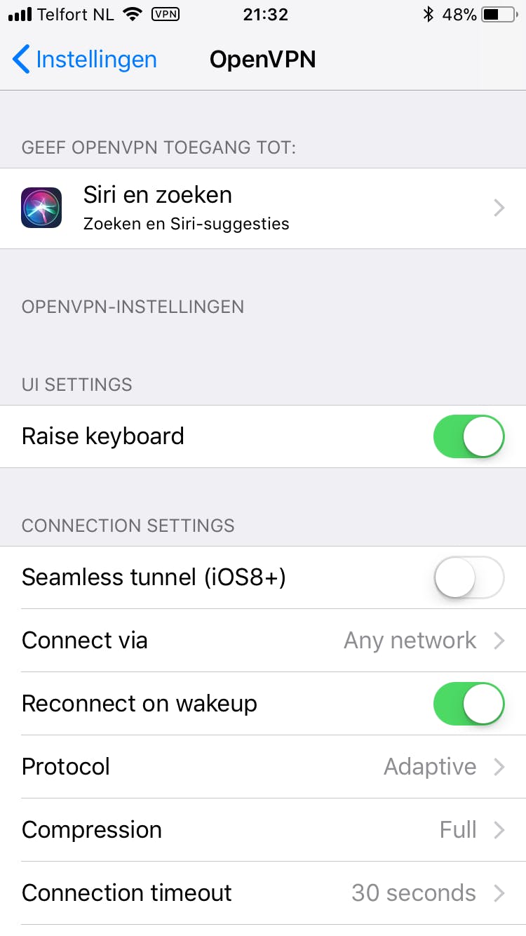 Op toestellen met Android open je binnen de app eenvoudig de instellingen van OpenVPN Connect, maar op een iPhone of iPad werkt dat anders. Tik vanuit het beginscherm van iOS op Instellingen en veeg een flink stuk omlaag. Via OpenVPN krijg je alle beschikbare opties te zien. Bij Connect geef je bijvoorbeeld aan dat je alleen binnen een wifi-netwerk een vpn-verbinding wilt gebruiken. Verder stel je bij Compression de mate van compressie in om eventueel het dataverbruik te verminderen. Je past ook allerlei geavanceerde instellingen aan, al is het voor doorsneegebruikers verstandig om daar niet mee te rommelen.