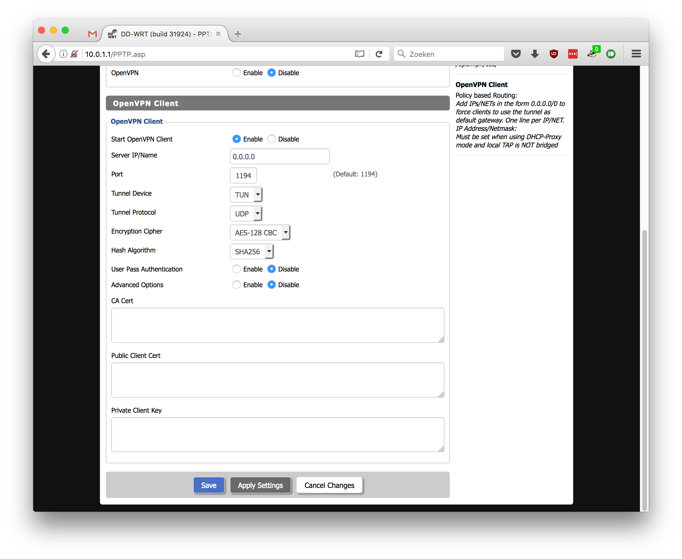 Dd-wrt wil nogal wat gegevens over de vpn-server weten. De juiste informatie tref je aan in het betreffende ovpn-bestand. Open dit bestand in Kladblok en klik bovenaan op Opmaak / Automatische terugloop. Je vindt tussen de codes <ca> en </ca> het ca-certificaat. Die kopieer je naar dd-wrt. Gebruik hiervoor het veld bij CA Cert in DD-WRT. Ook de velden bij Public Client Cert en Private Client Key vul je indien nodig op deze wijze in, al zijn de gegevens wellicht in aparte configuratiebestanden van de vpn-provider beschikbaar. Als alles in ingevuld, klik je op Save / Apply Settings. Ga naar Status / OpenVPN om de vpn-verbinding te controleren.