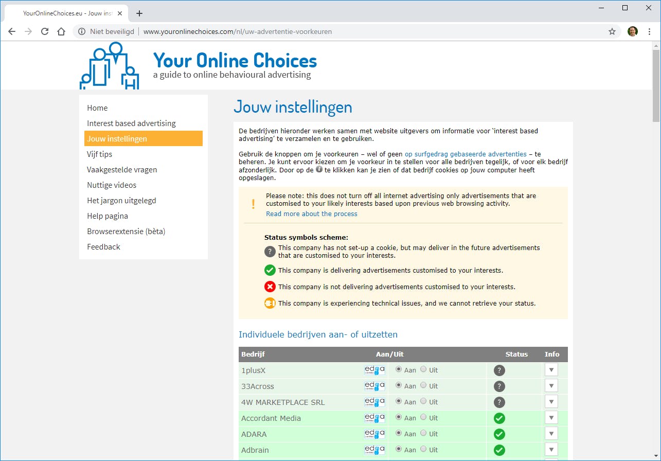 Veel advertentienetwerken personaliseren advertenties op basis van je online activiteit. Als je dat niet wilt, kun je dat bijvoorbeeld voor Google aanpassen. Hoewel Google met DoubleClick één van de grootste advertentienetwerken heeft, zijn er natuurlijk nog talloze andere advertentienetwerken die je surfgedrag in kaart brengen en gebruiken bij het tonen van advertenties. Via websites als Youronlinechoices.eu en networkadvertising.org kun je zien welke advertentienetwerken een actieve cookie in de browser hebben geplaatst, waarbij je een zogenaamde ‘opt-out cookie’ kunt genereren om te laten weten dat ze je surfgedrag niet (meer) mogen volgen. Let op: dat geldt alleen voor de browser die je op dat moment gebruikt. Er zijn natuurlijk nog heel wat andere opties om het volggedrag te beperken en anoniem(er) te surfen. Naast het gebruik van een ad-blocker (zie tip 2), kun je denken aan het gebruik van de speciale Brave-browser, het benutten van de incognito-modus van de browsers (die het opslaan van cookies voorkomt) en het surfen met de Tor-browser via het achterliggende Tor-netwerk.