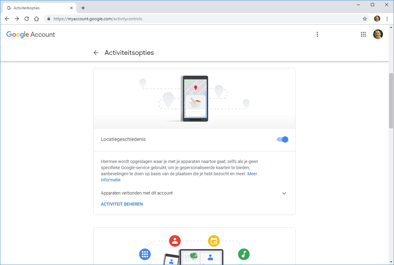 Google heeft net als Facebook een systeem waarbij apps en websites toegang tot jouw account kunnen krijgen en naast algemene accountinformatie soms ook bijvoorbeeld opgeslagen bestanden in Google Drive kunnen bekijken en beheren en je agenda of contactpersonen kunnen lezen. Op Myaccount.google.com kun je zien om welke apps of websites dat gaat en ook welke rechten ze hebben. Je kunt eventueel de toegang weer intrekken. Verder doe je er goed aan de informatie die in je Google-account wordt opgeslagen te controleren en zo nodig te beperken. Dit kan via Activity Controls. Voor elk onderdeel wordt een gedetailleerde uitleg gegeven. Zo kun je bijvoorbeeld voorkomen dat je zoekactiviteit wordt opgeslagen, dat de zoek- en/of kijkgeschiedenis bij YouTube wordt bewaard en dat je locatie op alle (ingelogde) apparaten wordt bijgehouden. Opvallend is dat Google zelden iets weg lijkt te gooien: informatie wordt tot zeer ver terug opgeslagen in je account. Op de bewuste pagina is dat ook inzichtelijk, en zie je bijvoorbeeld in een overzichtskaart waar je de afgelopen periode zoal bent geweest. Wellicht is het meteen ook een goed moment om je account wat beter te beschermen met tweestapsverificatie?