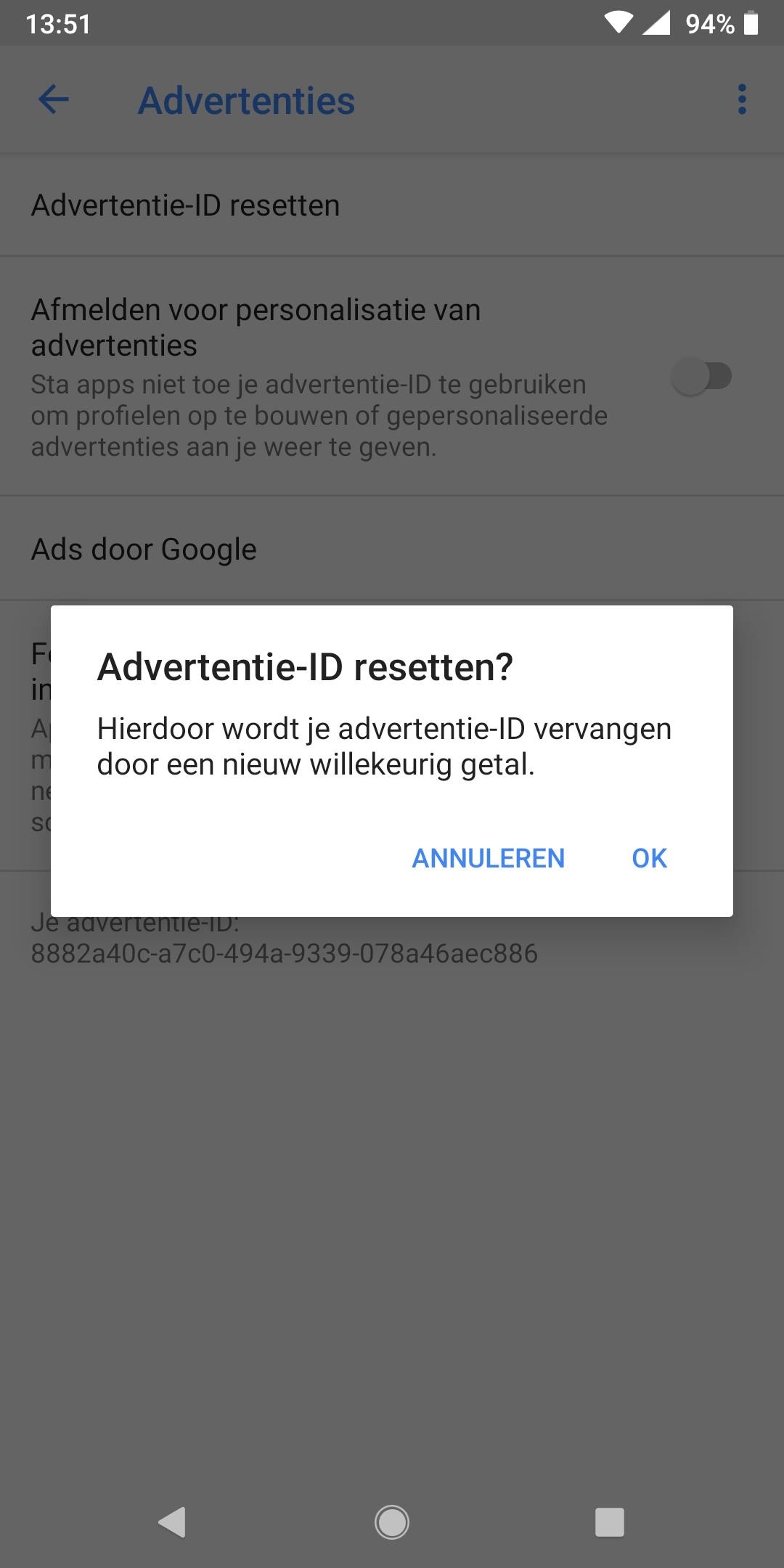 Geholpen door een uniek advertentie-id, die in iedere app en browser op de smartphone hetzelfde is, kunnen adverteerders je gemakkelijk volgen en een profiel over jou opbouwen. Iedere keer als je je aanmeldt voor een bepaalde dienst, en dus meer gegevens prijsgeeft, draag je hier verder aan bij. Bij Android heet dit de Google Advertising ID (aaid) en bij iOS de Identifier for Advertising (idfa). Je vindt ze, bij Android, onder Instellingen / Google / Advertenties. Bij iOS ga je naar Instellingen / Privacy / Reclame. Op beide platforms vind je een optie om die advertentie-id te resetten. Dat kun je enigszins vergelijken met het wissen van cookies in de browser op je pc. Ook kun je voorkomen (of beperken) dat apps gepersonaliseerde advertenties weergeven. Bedenk wel dat de makers van apps helaas regelmatig, ook al is dat strikt tegen de regels, andere details van je smartphone gebruiken (of met elkaar combineren) om je te identificeren. Dat gaat vaak om details die niet gereset kunnen worden, zoals het serienummer van je smartphone of imei-nummer van je simkaart.